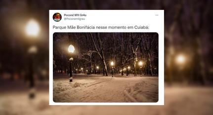 Em uma das imagens retiradas da internet, o Parque Mãe Bonifácia, na capital, aparece tomado pela neve. A capivara, símbolo de Poconé, virou “Capivara Polar” na web. A cidade amanheceu com mínima de 8°C nesta quinta.